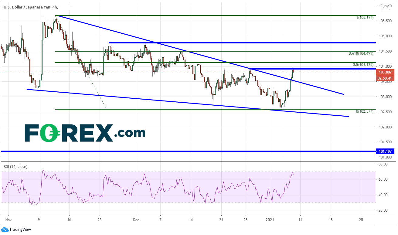 突破下降楔形后的目标在楔形的100%回档位,即105.67附近。但要回到该位任重道远。美元/日元4小时图正在测试水平阻力位兼2020年12月20日以来的前高点,即103.85附近。该位之上的阻力在2020年3月24日高点到1月6日低点行情的50%回档位和61.8%回档位。请小心空头在这些价位附近推低美元/日元。如果无力维持涨势,美元/日元可能下看楔形上轨趋势线103.50附近。如果失守,可能回落至1月6日低点102.59附近。